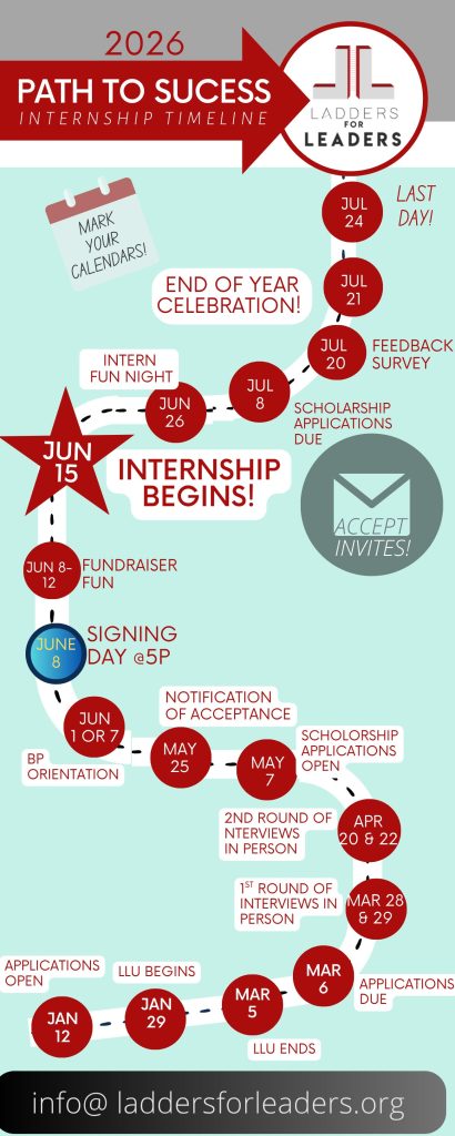 Ladders for Leaders will not only connect students with professional employment but will also provide job readiness training and guidance throughout the employment process. Students will learn how to obtain employment, conduct themselves in a professional manner, value time commitments, money management and develop workplace skills.